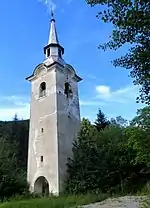 The local church is now only a ruin, with only the belfry and the walls of the nave remaining.[7] It was dedicated to Saint Florian and dated to around 1600. It was restored in 1890.[10] The church was first mentioned in a visitation report from 1753. It had a rectangular nave, apparently barrel-vaulted and plastered-over wood timbering. A wooden choir loft stood above the entrance and also provided access to the bell tower. The chancel was pentagonal and had a window on each side. The church was damaged during the German bombardment in 1943, when the roof timbering burned. It was not restored after the war, despite efforts from the local Lukan family. The parish abandoned the building in 1963, removing the bells. The rest of the furnishings were removed by various collectors, including the main altar with a statue of Saint Florian in the central niche and additional statues on the sides and in the pediment, a side altar with a statue of Saint Vitus, and a statue of Our Lady of Lourdes created by August König from Srobotnik.[4]