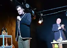Mitchell and Nixon's "Who is Number 1?", first performed in Brighton Fringe in 2023, is a comedy about the making of Patrick McGoohan's cult TV series, The Prisoner. The play "explores the age-old tensions between artist and patron, prophet and king, telling the truth and pleasing the crowd, and why artists sometimes risk everything for their vision".[21] It was first performed at the Latest Music Bar, Brighton, with Murray Simon as McGoohan, Ross Gurney-Randall as Lew Grade and Nigel Stock, and Robert Cohen and Brian Mitchell in multiple roles. In Fringe Review, Simon Jenner described it as "an outstanding script, with consummate acting; the phenomenal Simon – and Gurney-Randall – at its core. This should evolve beyond the Fringe. It ought to make London. It deserves awards."[22]