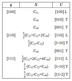 For specific symmetries the relationship between a specific combination of elastic constants, X, and acoustic wave velocities, ρV2, have been determined and tabulated.[7] For example, in a cubic system reduces to 3 independent components. Equation 5 shows the complete elastic tensor for a cubic material.[6] The relations between the elastic constants and can be found in Table 1.