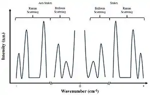 The figure also highlights the difference between Stokes and anti-Stokes scattering. Stokes scattering, positive photon creation, is displayed as a positive shift in wavenumber. Anti-Stokes scattering, negative photon annihilation, is displayed as a negative shift in wavenumber. The locations of peaks are symmetric about the Rayleigh line because they correspond to the same energy level transition but of a different sign.[4]