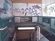 By the early 1990s, many homeless people were sheltered within the Broadway–Lafayette Street station and the tunnels near it.[57][58] Newsday wrote in 1992: "This one subway station has enough hidden corners, secret passages, dead-end mezzanines and staircases to nowhere to accommodate half the homeless population of New York."[57] The high homeless population at the Broadway–Lafayette Street station, and at the adjacent Second Avenue station, was attributed to their proximity to the rundown Bowery neighborhood.[59] The Metropolitan Transportation Authority (MTA), which operated the subway system, removed several benches from the station in 1990 to dissuade homeless people from staying there.[58] The benches were reinstalled after homeless advocates objected.[60] The MTA also removed two of the station's high entry-exit turnstiles in 1992 to increase passenger flow.[61] In April 1993, the New York State Legislature agreed to give the MTA $9.6 billion for capital improvements. Some of the funds would be used to renovate nearly one hundred New York City Subway stations,[62][63] including Broadway–Lafayette Street.[64]