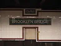 The station was originally placed on a sharp curve, requiring the installation of platform gap fillers.[27] Initially, the Brooklyn Bridge station was served by local and express trains along both the West Side (now the Broadway–Seventh Avenue Line to Van Cortlandt Park–242nd Street) and East Side (now the Lenox Avenue Line). West Side local trains had their southern terminus at City Hall during rush hours and South Ferry at other times, and had their northern terminus at 242nd Street. East Side local trains ran from City Hall to Lenox Avenue (145th Street). Express trains had their southern terminus at South Ferry or Atlantic Avenue and had their northern terminus at 242nd Street, Lenox Avenue (145th Street), or West Farms (180th Street).[28] Express trains to 145th Street were later eliminated, and West Farms express trains and rush-hour Broadway express trains operated through to Brooklyn.[29]