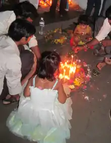 In Buddhism, symbolic offerings are made to the Triple Gem, giving rise to contemplative gratitude and inspiration.[1] Typical material offerings involve simple objects such as a lit candle or oil lamp,[2] burning incense,[3] flowers,[4] food, fruit, water or drinks.[5]
