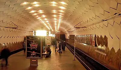 The station is a typical single vault (Khariv design). The two stations are also most extravagant, which is another trademark of ex-Soviet Metro systems. Whereas other stations make use of the architecture of the surface structure and arrange the interior to be aesthetic, this station is exactly the opposite. Red marble is used for the walls and floor; the ceiling of the vault consists of a hexagonal honeycomb arrangement. Three mosaics with a Soviet theme are present on both walls. Lighting comes from a series of light bulbs installed in the center of each hexagon on the apexal rows of the vault. However, for financial reasons, it is rare that they are all turned on at once.