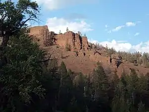 Beyond the reservoir, the highway enters the Shoshone National Forest. The Shoshone was set aside in 1891 as part of the Yellowstone Timberland Reserve. One of the oldest Forest Service ranger stations is situated in the Wapiti Valley. As the Indian name implies, The Wapiti Valley is home for the wapiti, or elk as well as the grizzly bear, bighorn sheep, moose, deer, and other wildlife. Buffalo Bill Cody built his hunting lodge, Pahaska Teepee, here beneath a sheltering cliff. This building is now listed on the National Register of Historic Places. The Wapiti Valley is home to fourteen historic lodges offering accommodation. At the head of the Wapiti Valley the highway enters Yellowstone National Park. and here the Byway ends, giving travelers an excellent route to the wonders of Yellowstone National Park.[1]