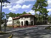 Buildings on the Main Campus are modeled in Spanish Mission architecture using terra stucco construction and terra cotta roofs, and are surrounded by picturesque landscaping featuring palms, pines, azaleas, camelias and a mix of other beautiful flowering plants. It features an attractive pedestrian mall of inlaid brick and well-designed seating areas.[2] The Rea and Lillian Steele North Campus is home to the Harley Langdale Jr. School of Business and Air Force ROTC Detachment 172, and is less than a mile north of VSU's main campus. The buildings follow a red brick modified form of Georgian architecture.[3]