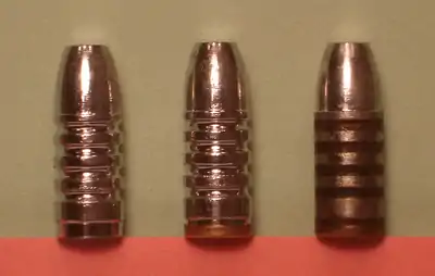 Hard cast solid bullet (left), with gas check (center) and lubrication (right)