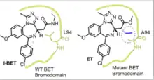 The BET (Bromodomains and Extra Terminal) family of proteins contain conserved motifs known as bromodomains (BDs) responsible for recognizing acetylated lysine on nucleosomal histones.[14] Recently, four members of the BET family, BRD2, 3, 4, and BRDT, each containing two bromodomains, were identified as important regulators of transcription.[15] In order to probe bromodomain-specific functions of members of the BET family, small-molecule inhibitors JQ1 and I-BET were developed, but they lacked inter- and intra-BET (between BDs on the same protein) selectivity.[16] The lab of Alessio Ciulli produced bump-and-hole pairs consisting of ET, a derivative of I-BET with an ethyl bump, and different members of the BET family with an L94A mutation in their BD1.[13] ET was found to have a 160-fold greater specificity for hole-modified BD1 of BET mutants compared to compared to the BDs of wild type BET proteins, giving BD-specific inhibition. The BD-ET bump-and-hole pairs were used to show that selective inhibition of BD1 in a BET protein disrupts chromatin engagement. Recently, the Ciulli group developed a new bump-and-hole pair consisting of BET mutants with a Leu to Val mutation in a BD and the bumped small-molecule inhibitor 9-ME-1. This bumped inhibitor was found to have an IC50 of 200nM and over 100-fold specificity for the L/V BET mutant BD over wild type BDs. This bump-and-hole pair allowed selective inhibition of specific BDs in specific BET proteins, elucidating their role in human cells. It was found that while BD1 is important for chromatin localization of BET proteins, BD2 regulates gene expression by binding and recruiting non-histone acetylated proteins, such as transcription factors.[17]