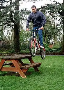 The bunny hop (mountain biking) or bunnyhop, also known as the J-Hop, is a bicycle trick that allows the rider to launch their bike into the air as if jumping off a ramp. The pedals on the bicycle stick to the riders feet as the bike becomes airborne with the clipless pedals that have clips. The pedals on the bicycle seem to stick to the rider's feet as the bike becomes airborne, much like how a skateboard seems to stick to the feet of the skater performing an ollie. While the bunny hop can be quite challenging to learn, once mastered it gives riding opportunities for both BMX and mountain bike rider alike.[1]