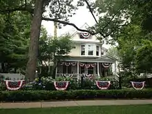 A bunting is any festive decorations made of fabric, or of plastic, paper or cardboard in imitation of fabric. Typical forms of buntings are strings of colorful, monochrome, beige triangular flags and lengths of fabric in the colors of national flags gathered and draped into swags or pleated into fan shapes.