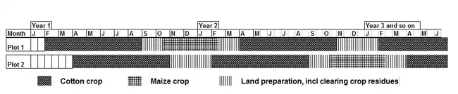 Every tenant was allocated two plots of 0.625 ha and a garden of 0.05 ha. Each year the tenants were to grow 1.25 ha cotton (main season) and 0.625 maize intercropped with cowpeas (off-season). After the fourth year 0.2 ha of the maize would be replaced with the much more profitable groundnuts. The cropping pattern of 148% was very tight as together the maize and cotton crops needed almost a year in the field and thus there was very little time left for land preparation. To solve this problem an ingenious cropping system was developed in which each tenant had two plots. On one plot he would plant early cotton (1 February) and after harvesting the cotton he would plant maize and harvest maize. Next year, this plot will then be ready for late cotton (March-early April). After the late cotton is harvested, there will be enough time to prepare the land for the early cotton. The second plot would start with late cotton, then early cotton, maize and again late cotton. Planting cotton after early April not only results in low yields but also disrupts the whole cropping calendar. In practice this cropping pattern lacked flexibility and planting periods for cotton of four months occurred.[35] A comparison of the projected yield and the actual production figures for cotton and maize is given in the tables below: