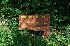 Burches Run Wildlife Management Area, formerly Burches Run Lake WMA, is located on 55 acres (22 ha) near Wheeling in Marshall County, West Virginia. Until 2005 the wildlife management area contained a lake[3] impounded by a dam at risk of failure.[4] The name change occurred after the dam was removed. The terrain climbs gently above Burches Run and is covered by a mature oak-hickory second-growth forest.[3]
