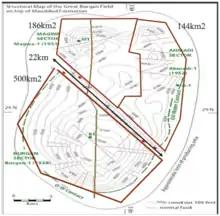 The Greater Burgan, a wider area around Burgan, is the world largest sandstone (clastic) oil field with the total surface area of about 1000 km2. It includes three producing subfields: Burgan itself (500 km2), Magwa (180 km2) and Ahmadi (140 km2).[3][4] The Burgan field's structure is an anticlinal dome having an elliptical shape and transected by numerous radial faults.[1] Both Magwa and Ahmadi are located on smaller, subsidiary domes north of Burgan.[5]