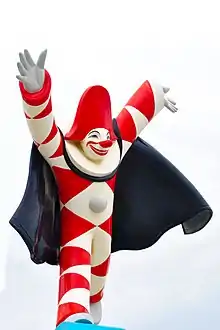 Burlamacco is the clown-like figure which presides over the Carnival in the Tuscan town of Viareggio, and is the town's mascot.[2] Burlamacco was first depicted in 1931 by Uberto Bonetti; a competition had been held for the design of the mascot and his was the winning entry. He had chosen the red and white of the outfit from the traditional colours of the umbrellas on the beach at Viareggio and the name came 8 years later; it is derived from the Burlamacca River. To this day Burlamacco remains a feature of the Carnival and there is a statue of him all the year round on the Lungomare in Viareggio.