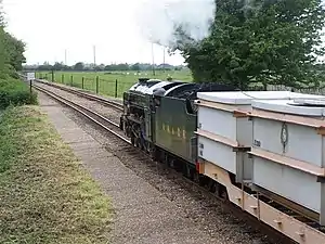 Officially opened on 16 July 1927, this station was then called Burmarsh for East Dymchurch and was equipped with two platforms, a booking office, a waiting room, and possibly a signal box (historical accounts vary on this last point, most suggesting the booking office housed a lever frame controlling just two signals). Later the station name was changed to Dymchurch Bay. Traffic levels fell sharply after the Second World War, and the station was eventually reduced in status to a halt and again renamed as Burmarsh Road Halt. It closed in 1948, re-opened in 1950, but finally closed again at the end of that same year, when the station buildings were demolished. The roof of the booking office was left in situ, on pillars (with the walls removed), to form a waiting shelter in the event of re-opening, but this structure was also demolished a few years later. However, the station was again re-opened on 7 September 1977 as the starting point of the school train service run for Kent County Council, transporting local children to Southlands Comprehensive School in New Romney. Declining use meant that the school train last ran on 24 July 2015.[1]