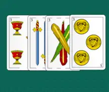 Burro (English: donkey) or los burros[1] is a card game played with Spanish playing cards. The principal objective of the game is to get four cards of the same number. The ideal number of players is from 4 to 8.[2]