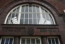 The original West Suffolk County School coat of arms, seen above the old Northgate Street building entrance, consist of a gold cross fleury between five martlets on a blue shield and were the arms of Edward the Confessor, who in the 11th century granted land to the abbey of St Edmund,[29] and those of the old West Suffolk County Council.[30] The contemporary County High School coat of arms has four birds around a cross surmounted by the Saxon Crown[31] of St Edmund, the last King of East Anglia.[32] The blue sweaters with an all gold crest worn by today's pupils echo the colours of Edward the Confessor and are used by the school sports teams and on the school flag.