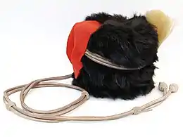 In the United Kingdom busbies are of two kinds: (a) the hussar busby, cylindrical in shape, with a bag; this is worn by hussars and the Royal Horse Artillery; (b) the rifle busby, a folding cap of astrakhan (curly lambswool) formerly worn by rifle regiments, in shape somewhat resembling a Glengarry but taller. Both have straight plumes in the front of the headdress.[9] The headdress is worn with full dress by the Waterloo Band of The Rifles, the Royal Horse Artillery and ceremonial detachments at regimental expense. In its hussar version it is now made of black nylon fur, although Bandmasters still retain the original animal fur.[10] The busby should not be mistaken for the much taller bearskin cap, worn most notably by the five regiments of Foot Guards of the Household Division (Grenadier, Coldstream, Scots, Irish and Welsh Guards). Around 1900 the word "busby" was used colloquially to denote the tall bear and racoonskin "caps" worn by foot guards and fusiliers and the feather bonnets of Highland infantry.[9] This usage is now obsolete.