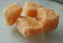 Tablet (taiblet in Scots[1][2][3]) is a medium-hard, sugary confection from Scotland. Tablet is usually made from sugar, condensed milk, and butter, which is boiled to a soft-ball stage and allowed to crystallise. It is often flavoured with vanilla and sometimes has nut pieces in it.[2][4]