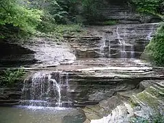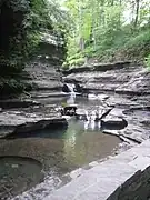 The rock formations within the park are primarily made of Devonian shale and sandstone.[7] These rocks formed in horizontal layers, creating flat slabs and angular edges as they erode and fracture. The gorge and waterfalls formed since the last ice age — within the last twenty or thirty thousands years — as Buttermilk Creek eroded back from the head of a hanging valley.[7] Additional formations along the creek include potholes and a stack called "Pinnacle Rock".