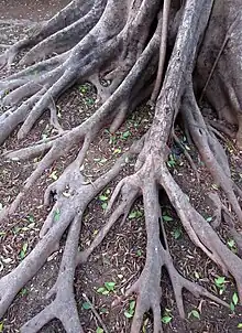Buttresses are tension elements, being larger on the side away from the stress of asymmetrical canopies.[1] The roots may intertwine with buttress roots from other trees and create an intricate mesh, which may help support trees surrounding it. They can grow up to 30 feet (9 m) tall and spread for 30 m (100 ft) above the soil then for another 30 m (100 ft) below. When the roots spread horizontally, they are able to cover a wider area for collecting nutrients. They stay near the upper soil layer because all the main nutrients are found there.[2]