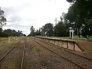 The station is located on a crossing loop. The station building has been demolished after burning down. Current platform and sign built 1990s.