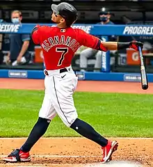 On December 29, 2019, Hernández signed a one-year contract with the Cleveland Indians.[41] Overall with the 2020 Cleveland Indians, Hernández batted .283/.355/.408 with a league-leading 20 doubles, three home runs, and 20 RBIs in 58 games.[42] He also earned his first career Gold Glove Award after finishing second among American League second basemen in defensive runs saved and posting a .981 fielding percentage.[43] Hernández became a free agent following the 2020 season.