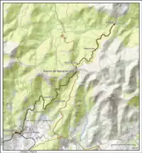 Line C-9's 18.2 km (11.3 mi) route begins at Cercedilla Station on the Madrid-Segovia railway line,[1] approximately 45 km (28 mi) northwest of Madrid. From this station at an altitude of approximately 1,150 m (3,770 ft) above sea level, the line slowly climbs up the southern slopes of Siete Picos through Fuenfría Valley until it reaches Navacerrada Pass Station at an altitude 1,765 m (5,791 ft). From here, the railway line crosses the drainage divide of the Guadarrama Mountains and enters Valsaín Valley in Segovia Province. After a gradual climb, the line reaches its terminus of Cotos Station with a peak elevation of 1,819 m (5,968 ft) above sea level.[10] The total gain in elevation of the line is 719 m (2,359 ft).