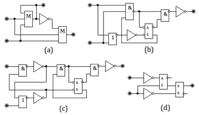 Majority-gate realization of C-element and inclusive OR gate (a); Realizations proposed by Maevsky (b), Tsirlin (c) and Murphy (d)