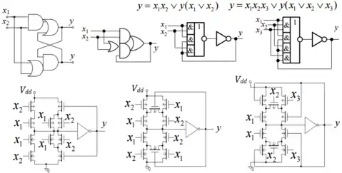 There is a number of different single-output circuits of C-element built on logic gates.[42][43] In particular, the so-called Maevsky's implementation [44][45][46] is a semimodular, but non-distributive (OR-causal) circuit loosely based on.[47] The NAND3 gate in this circuit can be replaced by two NAND2 gates. Note that Maevsky's C-element is actually a Join element, whose input signals cannot switch twice.[44] Yet another circuit with OR-causality, which operates as a Join element.[48] A realization of C-element on two-input gates only has been proposed by Tsirlin [49] and then synthesized by Starodoubtsev et al. using Taxogram language[50] This circuit coincides with that attributed to Bartky ,[1][44] and can operate without the input latch. Note that both the Maevsky and Tsirlin circuits are based actually on so-called David cell.[51] Its fast transistor-level implementation is used in the semistatic C-element proposed.[52] Yet another semistatic circuit using pass transistors (actually MUX 2:1) has been proposed.[53]. Yet another version of the C-element built on two SR-latches has been synthesized by Murphy[54] using Petrify tool. However, this circuit includes inverter connected to one of the inputs. This inverter should have small delay. However, there are realizations of RS latches that already have one inverted input, for example.[55] Some speed-independent approaches[56][57] assume that zero-delay input inverters are available on all gates, which is a violation of true speed-independence but is fairly safe in practice. Other examples of using this assumption also exist.[58]