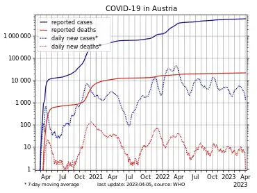 - ↑ "Austria: WHO Coronavirus Disease (COVID-19) Dashboard With Vaccination Data". covid19.who.int. Retrieved 27 February 2023.