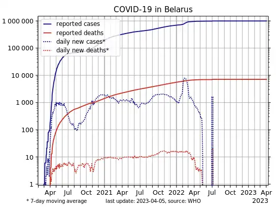 The COVID-19 pandemic in Belarus was a part of the ongoing worldwide pandemic of coronavirus disease 2019 (COVID-19) caused by severe acute respiratory syndrome coronavirus 2 (SARS-CoV-2). The virus was confirmed to have spread to Belarus, when the first case of COVID-19 in the country was registered in Minsk on 28 February 2020.[2] As of 29 January 2023, a total of 19,047,714 vaccine doses have been administered.[3]