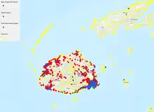 In August 2021, the number of daily cases dropped as a result of the Ministry of Health's decision to suspend its contact tracing efforts and focus instead on monitoring patients at higher risk.[23] From mid to late August 2021, the virus reached the main island of Vanua Levu, outer islands of Malolo, Naviti and Kadavu, as a result of breaches in travel restrictions.[24][25][26]