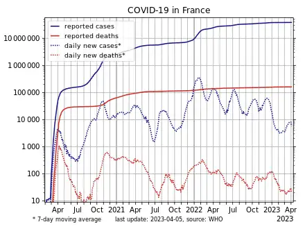The COVID-19 pandemic in France has resulted in 38,997,490[2] confirmed cases of COVID-19 and 167,985[2] deaths.