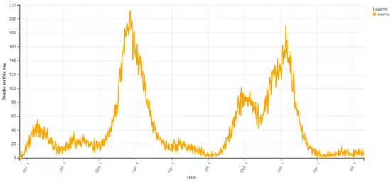 By January 3, 2021, the total number of deaths had increased to 9,076.[70] By January 6, the number of total hospitalizations had increased to 40,104.[71] By January 7, 753,068 total cases had been reported.[72] By January 14, 807,293 cases had been reported, leading to 9,990 deaths.[73] By January 15, the total number of deaths surpassed 10,000.[74] The number of deaths surpassed 11,000 on January 28.[75]