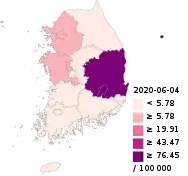 The COVID-19 pandemic in South Korea is part of the worldwide pandemic of coronavirus disease 2019 (COVID-19) caused by severe acute respiratory syndrome coronavirus 2 (SARS-CoV-2). The first case in South Korea was announced on 20 January 2020.[3] The number of confirmed cases increased on 19 February by 20, and on 20 February by 58[4] or 70,[5] giving a total of 346 confirmed cases on 21 February 2020, according to the Korea Disease Control and Prevention Agency (KDCA), with the sudden jump mostly attributed to "Patient 31" who participated in a gathering at a Shincheonji Church of Jesus the Temple of the Tabernacle of the Testimony church in Daegu.[5][6]