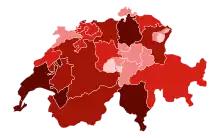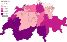 ![]() Map of cantons in Switzerland by number of confirmed cases (as of 13 August 2020)[1] 1-99 cases 100-499 cases 500-999 cases 1,000-2,499 cases 2,500+ cases | |