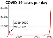 Infection rates increased in 2022, and on 3 April of that year, China reported 13,146 new cases of COVID-19 in the past 24 hours, which was the highest single-day total of new cases since the height of the 2020 outbreak.[14] Following nationwide protests in November and December of that year, the Chinese government relaxed many of its previous restrictions, effectively ending the zero-COVID policy and leading to a massive surge in cases.[15]