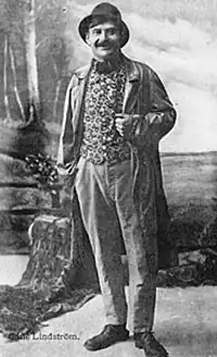 Calle Lindström had perhaps the most varied background of any peasant comic. Born in 1868, in his youth he was a circus artist, who worked in every facet of the entertainment industry. The concertina was his instrument as he regaled audiences despite missing four fingers on his right hand — he had to turn the instrument upside down and hide the disfigured hand with a handkerchief. He sometimes used a method of presentation called the "tintamarresque theater". A common practice in Swedish variety halls, the performer would stand behind a photographed foreground and slip his head through an opening in the picture for comic effect.[2]