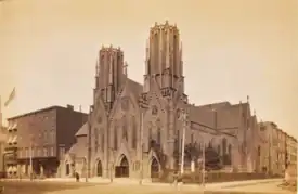 The Calvary Church parish was founded in 1832, and initially used a wooden-frame church on what was then Fourth Avenue – which has since become Park Avenue – uptown of its current site.[2][3] That building was moved to the current location in 1842,[3] and the new Renwick-designed Gothic Revival sanctuary was completed in 1848.[3] Renwick patterned Calvary after twin-towered French cathedrals, but, unlike Grace Church, Calvary was constructed of brownstone.[4] The church's two wooden spires were removed in September 1860 when they became unstable; the octagonal bases remained but eventually deteriorated and were removed in 1929.[5][6]