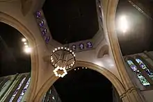 The 1991-1993 restoration included plaster repairs, cleaning of stone, and addition of handicapped access ramps. The pendant lights were moved to the center of the bays to provide more uniform light, and a new wood floor was installed to replace the former wood floor under the pews to improve the acoustic performance of the space. A crossing platform was added to extend the level of the chancel towards the nave and to provide a place for a temporary altar closer to the congregation for medium-sized services (the transept pews were turned to face the new platform at this time); the new platform also provided safer passage to the lectern. New floor tile for the platform was carefully made by hand in North Carolina so as to match the original and allow for repairs to the original floor where needed. The crossing chandelier, having been taken down and deconstructed (the large ring had been used in the Narthex), was restored and reconstructed from pieces found in the basement. The All Saints' Chapel altar rail, installed in 1924, was removed and relocated to the baptistery (the chapel had been renamed "All Saints' Chapel" from "St. Andrew's Chapel" around 1940). The new parclose screen in the All Saints' Chapel was made by Herbert Read Ltd. of Tiverton, Devon, England. In the Lady Chapel, two reconstructions of the original electric lamps designed by Cram's partner Bertram Goodhue were hung in the space. A wood screen was added to define the space of the All Saints' Chapel, and an original lighting fixture was installed.[4]