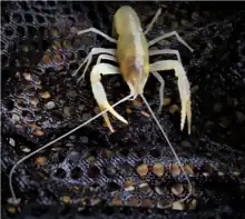 Cambarus zophonastes, also known as the Hell Creek Cave crayfish, is named for its original location of discovery, Hell Creek Cave. It is also found in other similar habitats in Stone County and Marion County, Arkansas.[3] These habitats include springs and caves such as Nesbitt Spring Cave in Stone County. C. zophanastes is critically endangered according to the IUCN (International Union for Conservation of Nature).[1] C. zophanastes is also protected by the ESA (Endangered Species Act) as an endangered species.[4] Currently conservation efforts focus on monitoring populations, reducing disturbances, and monitoring water quality. More research has to be conducted to better understand and conserve the species.