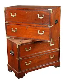 The most common item of campaign furniture is the chest of drawers, often referred to as a military chest or campaign chest. Campaign chests' primary wood was often mahogany, teak, or camphor, although cedar, pine and other woods were also used. The dominant type breaks down into two sections, and has removable feet. The brass corners and strapwork offer some protection and typify the distinctive "campaign look".