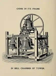 The Ellacombe apparatus is an English mechanism devised for chiming by striking stationary bells with external hammers. However it does not have the same sound as full circle ringing due to the absence of the doppler effect derived from bell rotation and the lack of a damping effect of the clapper after each strike.