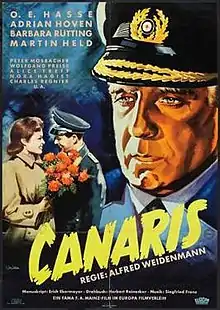 Canaris is a 1954 West German drama film directed by Alfred Weidenmann and starring O. E. Hasse, Barbara Rütting and Adrian Hoven. It portrays real events during the Second World War when Wilhelm Canaris the head of German military intelligence was arrested and executed for his involvement with the 20 July Plot to overthrow Adolf Hitler. The film was a major success at the German box office, possibly because it allowed audiences to identify with a heroic German figure disassociated from Nazism.[2] Released in the UK as Canaris Master Spy, and in the US as Deadly Decision—it is also known by the alternative title Canaris: Master Spy.