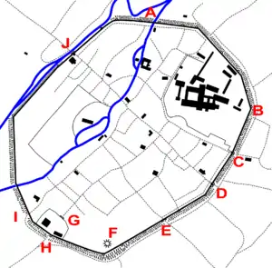 The walls had at least five gates, typically positioned near angles in the city wall, although, judging from the location of Roman roads, it is possible that another two Roman gates may also have existed.[11] The gates linked to the network of major roads that ran across Kent.[12] The Riding Gate, which took its name from the red bricks with which it was built, had two protective towers and a pair of entrance arches for pedestrians and carriages, as probably did Burgate.[13] The Worth Gate, the London Gate and the Queningate had simpler entrance arches.[14] A sequence of square towers protected the walls, and at least one additional wall tower was constructed following the Saxon invasion of Britain in 367.[14]