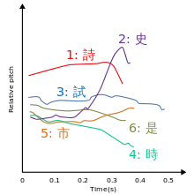 The relative pitch of the tones varies with the speaker; consequently, descriptions vary from one sources to another. The difference between high and mid level tone (1 and 3) is about twice that between mid and low level (3 and 6): 60 Hz to 30 Hz. Low falling (4) starts at the same pitch as low level (6), but then drops; as is common with falling tones, it is shorter than the three level tones. The two rising tones, (2) and (5), both start at the level of (6), but rise to the level of (1) and (3), respectively.[12]