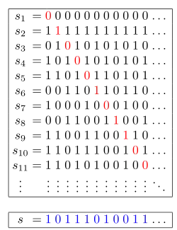 Next, a sequence s is constructed by choosing the 1st digit as complementary to the 1st digit of s1 (swapping 0s for 1s and vice versa), the 2nd digit as complementary to the 2nd digit of s2, the 3rd digit as complementary to the 3rd digit of s3, and generally for every n, the nth digit as complementary to the nth digit of sn. For the example above, this yields
