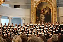 The performing choir comprises ca. 140 8-to-25-year-old boys and men. The assembly of the choir is SSAATTBB (1st and 2nd soprano, 1st and 2nd alto, 1st and 2nd tenor, 1st and 2nd bass). After puberty, boys proceed from boy voices to male voices. Each voice has its own prefect, who is the "leader" of his voice and is responsible for keeping order. The prefect is the position of trust appointed by conductor of the choir. The choir actively practices several times a week and give concerts both at home and abroad.