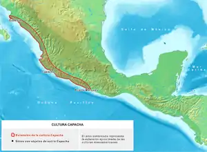 The Capacha Culture[11] includes nine sites identified in the eastern half of the state of Colima. Archaeological elements of this tradition have been discovered in the states of Nayarit, Jalisco, Sinaloa, Guerrero, Morelos, Michoacán and Mexico.[12]